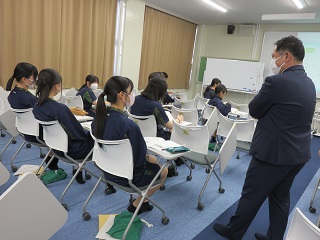 学校設定科目「地域の文学」の授業で、茨木のり子研究家(安城学園高等学校副校長)の熊谷誠人先生にお越しいただき、愛知県にゆかりのある詩人 茨木のり子の詩について学びました。詩「自分の感受性くらい」を深く理解するために、のり子が小学校5年生の時に書いた日記の記事を読み、またのり子の学生時代の時代背景を考えながら詩に込められたのり子の想いを感じ取りました。詩を味わう楽しさ、面白さ、そして平和についても考えさせられた実に奥深い授業でした。
