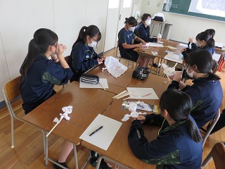 ABO NON KIKAKU 安保成子さんに来校していただき、「古から学び、今のデザインを未来へつなぐ」という授業をしていただきました。有松絞りの歴史や絞り方の技法を学び、バンダナを使って有松絞りの体験もしました。ひとりひとりが完成デザインをイメージしながら絞ったバンダナの仕上りが楽しみです。