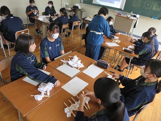 2学期末には、再び岡田農園の岡田様に、マコモダケのしめ縄作りを教えていただきます。