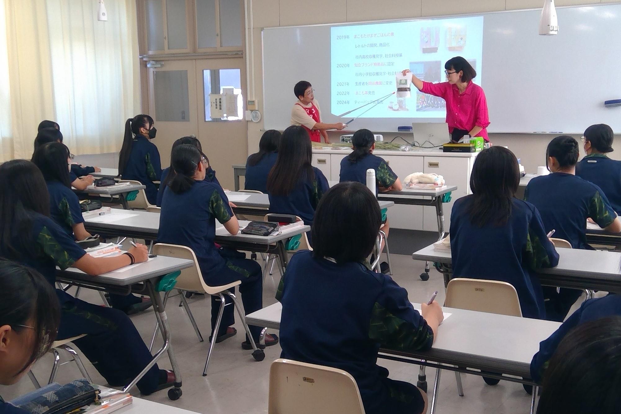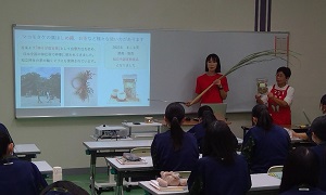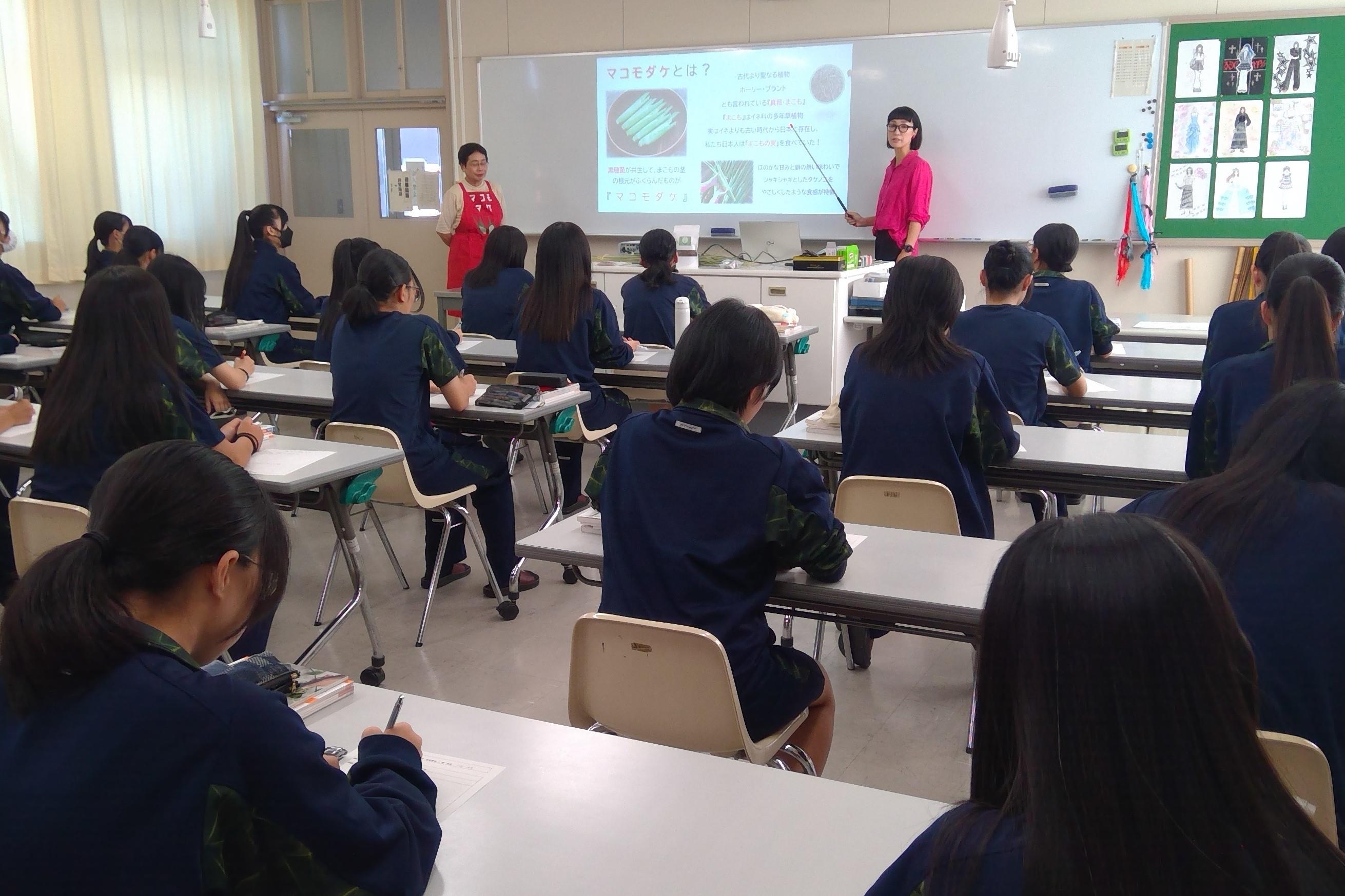 9月12日(木)の講義では、マコモダケの特徴や収穫までの工程、調理方法などの基本的な内容から、可食部以外を活用した商品開発、周知活動についての話も聞くことができました。マコモダケのことだけでなく、商品開発や周知活動の話もとても興味深く、生徒の心に残る講義となりました。