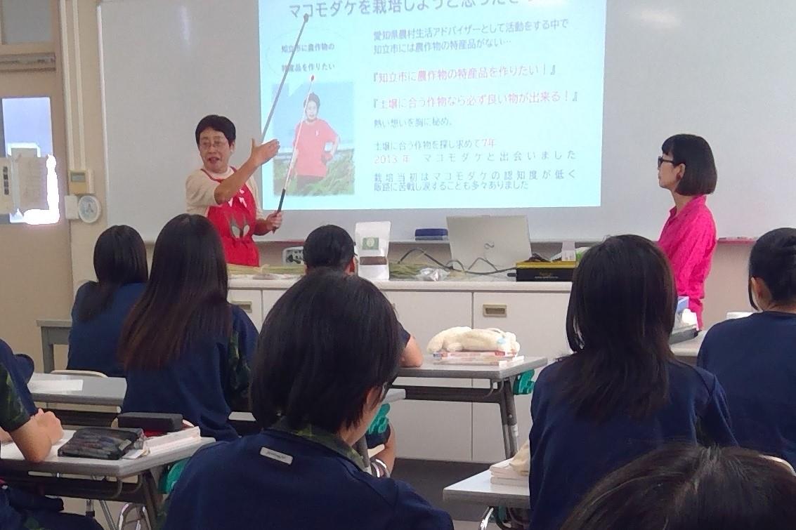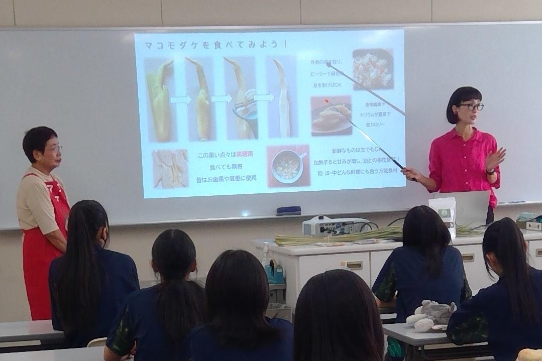 9月の授業では外部講師として知立マコモ研究会から岡田夏江様、岡田めぐみ様をお招きし、知立の特産物まこもたけについて説明をしていただきました。まこもたけの特徴や調理、商品開発などの内容を大変興味深く聞くことができました。(この授業の模様はケーブルテレビKATCHにて放映されました。)
