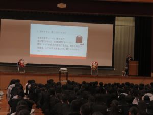 後方の生徒はプレゼンテーションルームの横に配置してある大型テレビを見ながら講話を聞きました。