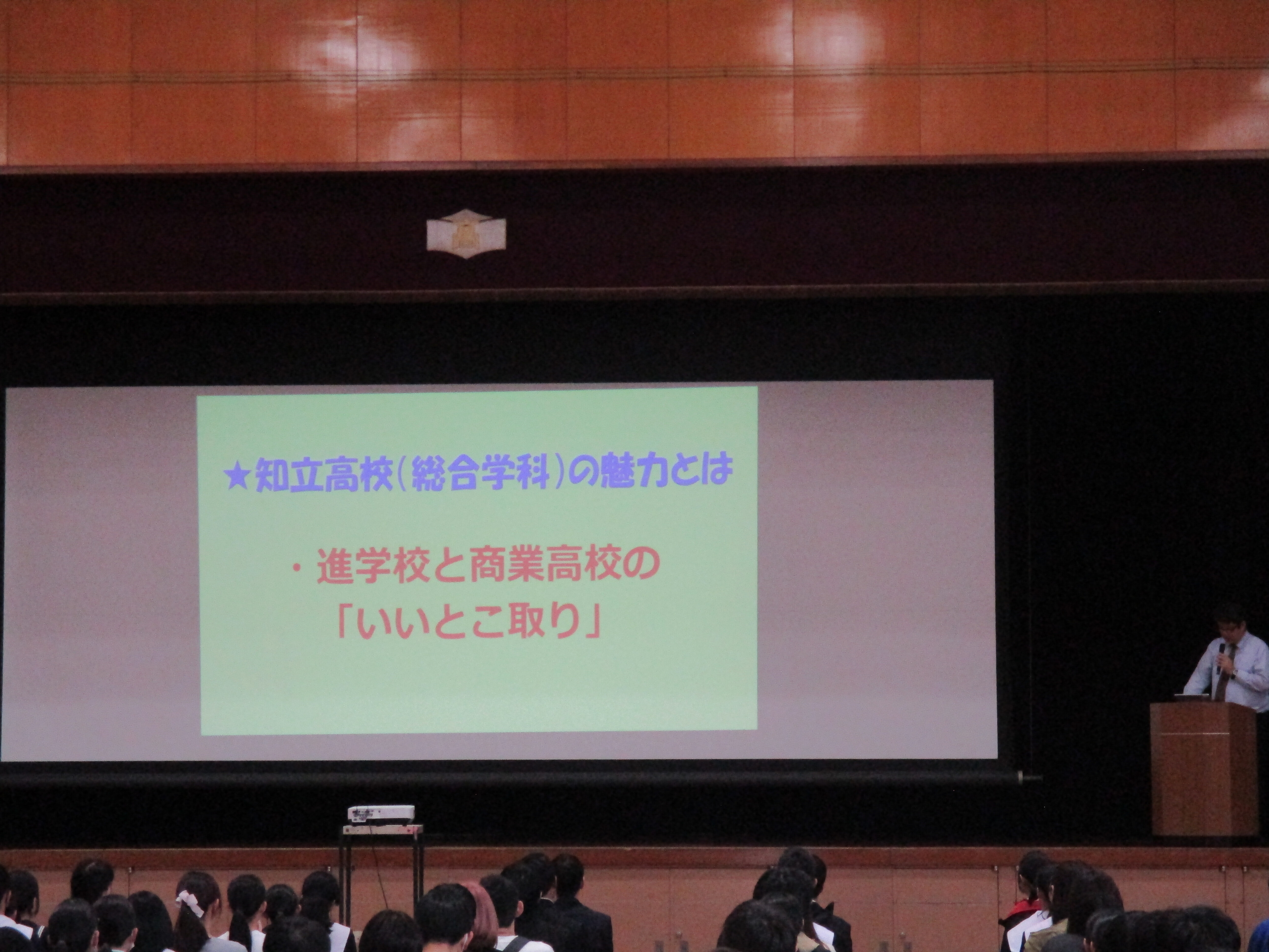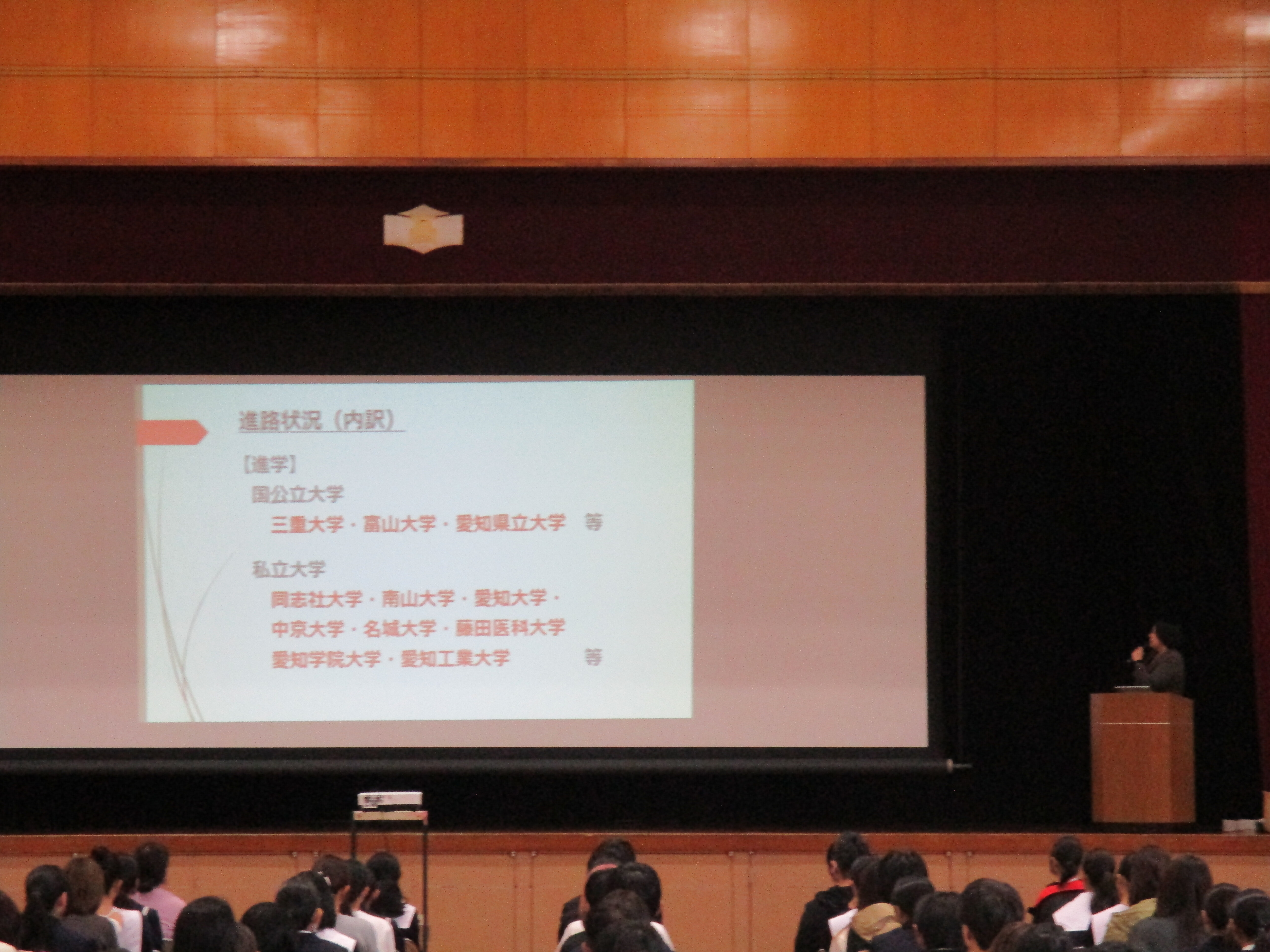 知立高校総合学科の「系列」について、また、卒業後の進路についての説明に加えて、在校生(2年生)代表生徒によるトークセッション、午前に引き続き総合的な探究の時間の発表、さらに、選択科目スポーツWの授業成果の発表、施設見学などを行いました。参加された約250名の中学生と保護者の皆様、ありがとうございました。