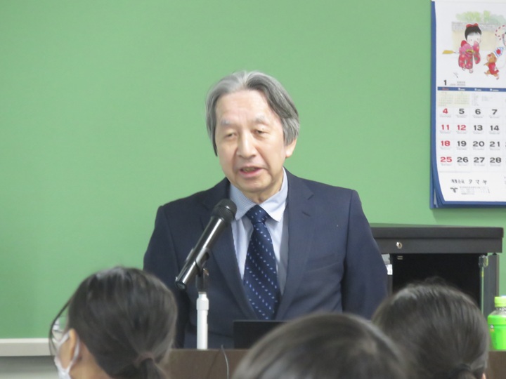 後方の生徒はプレゼンテーションルームの横に配置してある大型テレビを見ながら講話を聞きました。